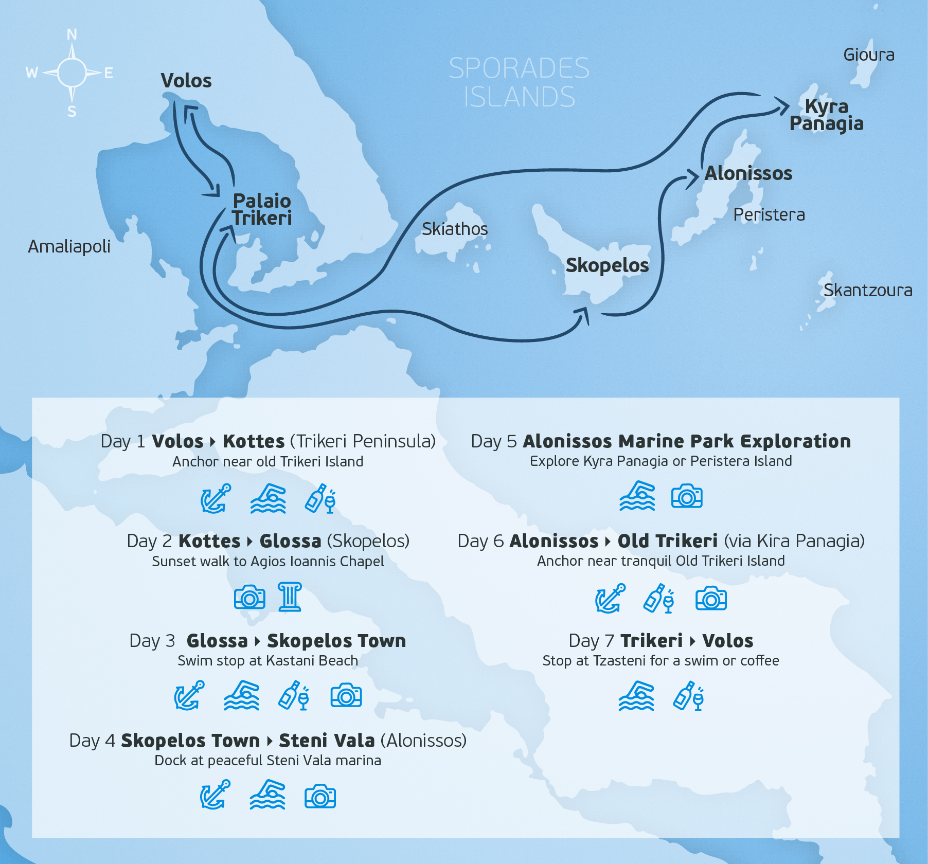 Relax stop: Tzasteni Cove Return: Volos Marina Activities: Morning Swim | Smooth Sail | Last Espresso by the Sea
