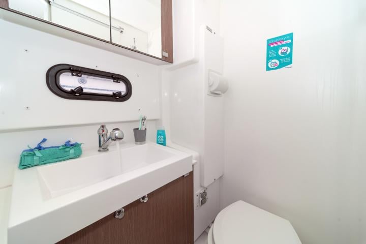 Thanks to three opening ports, there’s an abundance of natural light and ventilation. The ample berth has side access, and there’s a nice shelf for books and knickknacks. On a yacht with abundant creature comforts, this space is certainly in keeping with the overall theme.