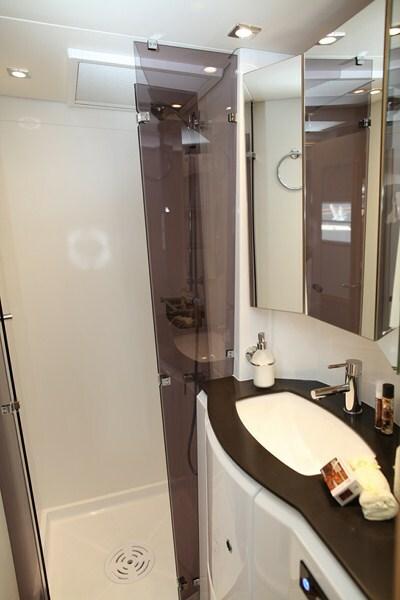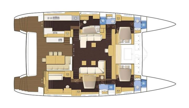 8 guests in 1 Master cabin with en-suite bathroom & private lounge with direct access to the cockpit, 2 guest cabins with double beds & independent en suite bathrooms and 1 guest cabin with 2 bunk beds, desk & independent en suite bathroom.