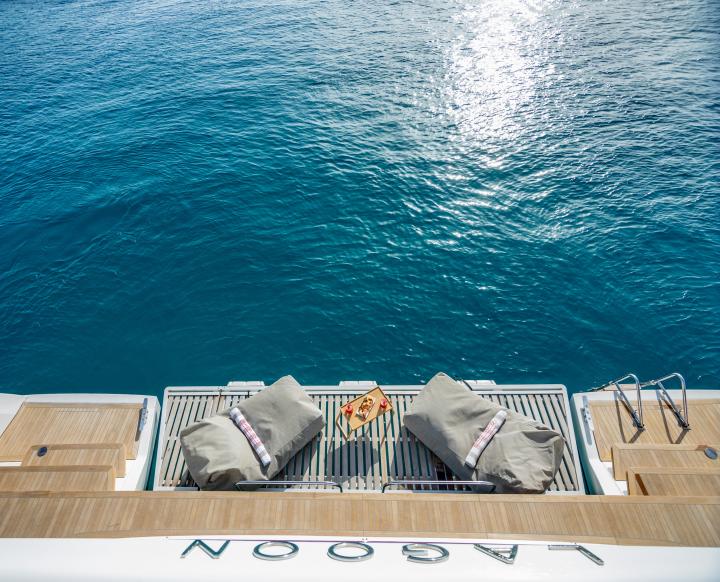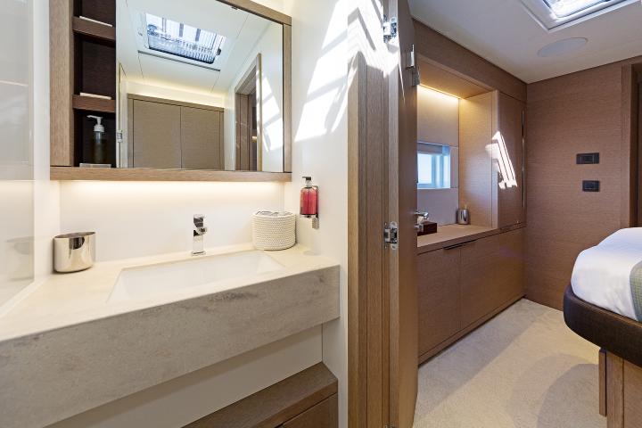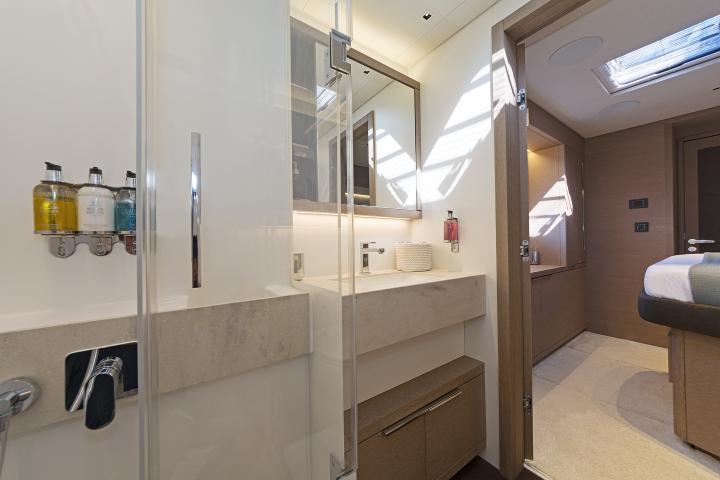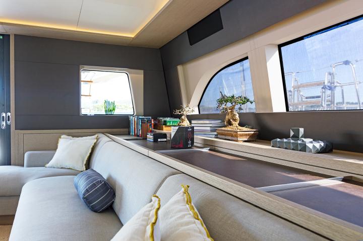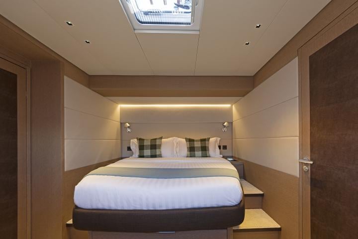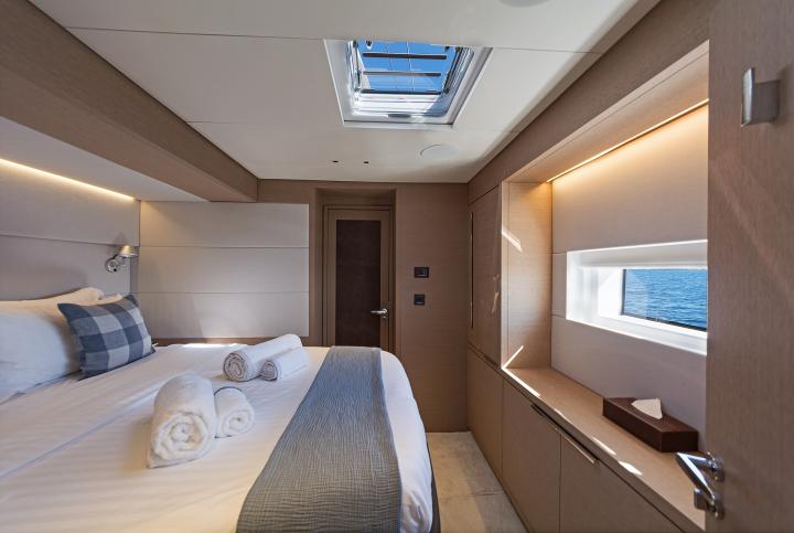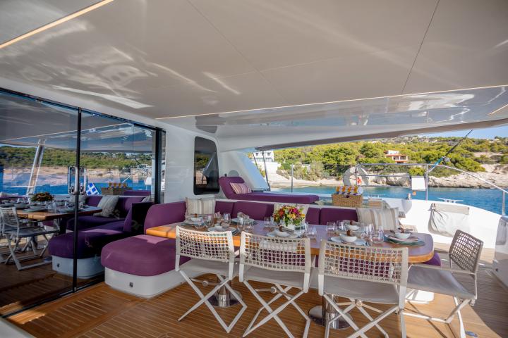 Sleek, intrepid & unique promises to deliver the most spectacular sailing experience across the Greek islands. The main saloon abundant of spaces & natural light assures cruising in style and comfort while the Master cabin offers swift access from the salon and the 4 additional guest cabins enjoy as well incredible views . High-end audio system with 25 speakers on board offers individual use in each cabin and outdoor area.