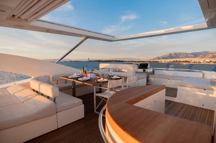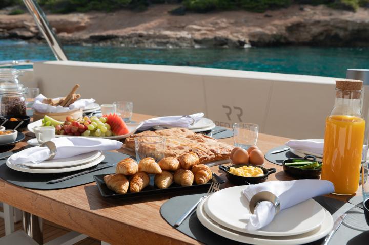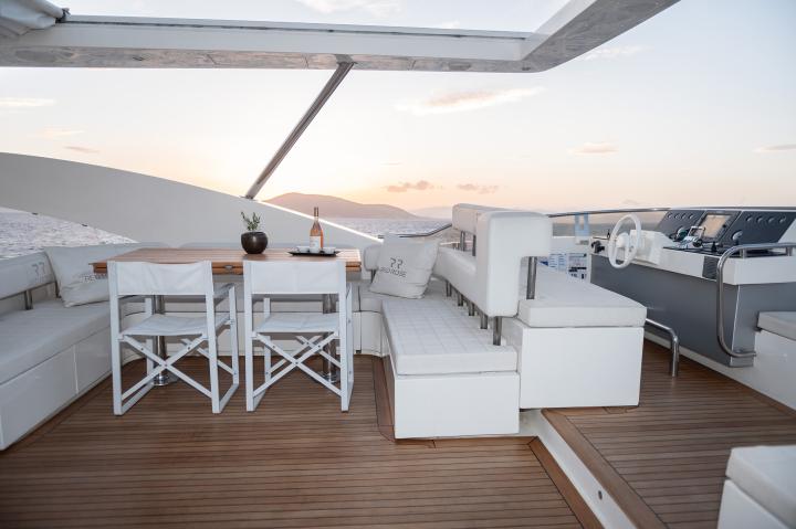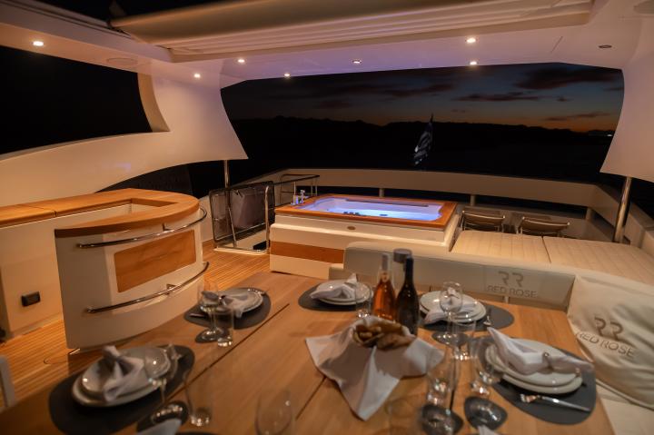 Designed for outdoor indulgence, Red Rose offers expansive deck spaces featuring a spacious jacuzzi and a larger hardtop than most yachts in her class. Her generous seating areas create the perfect setting for all-day alfresco dining, from a light morning breakfast to a leisurely lunch and an exquisite evening feast under the stars.