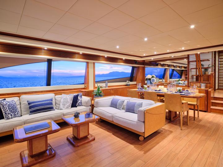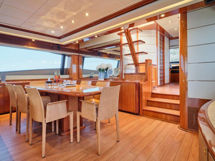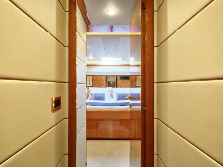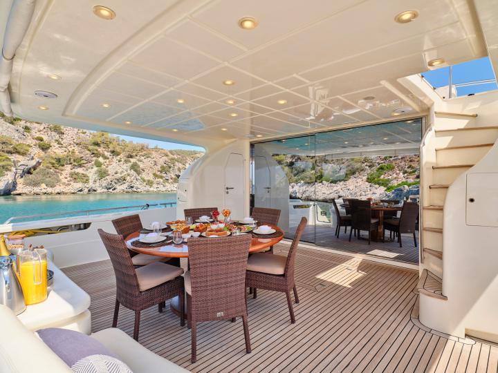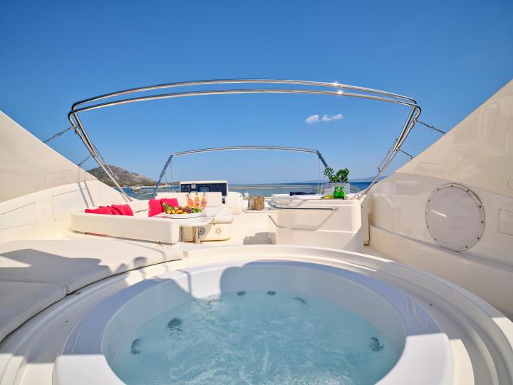 8+1 guests in a master suite, a VIP cabin and 2 twin cabins (one with an extra pullman berth), all with ensuite facilities. A spacious sundeck fully equipped with large sun beds for lounging, an alfresco dining area and a Jacuzzi