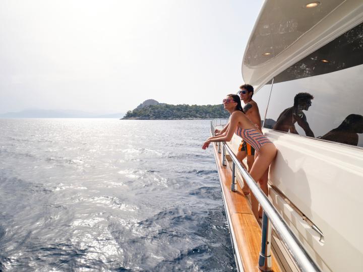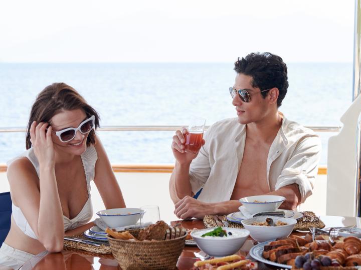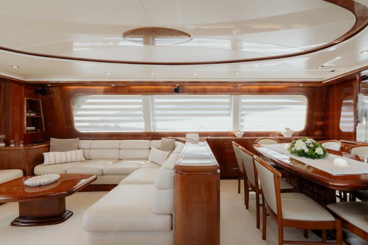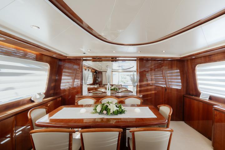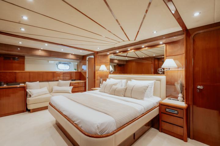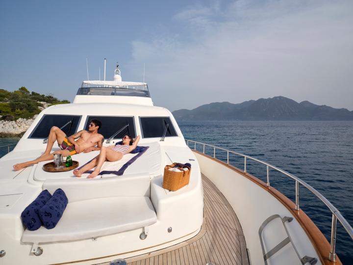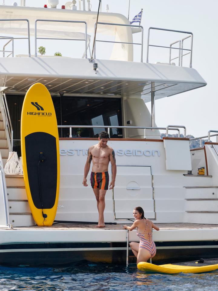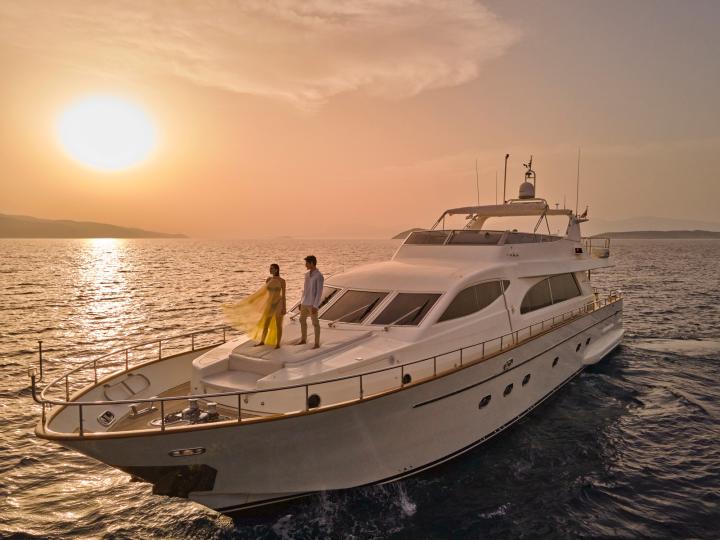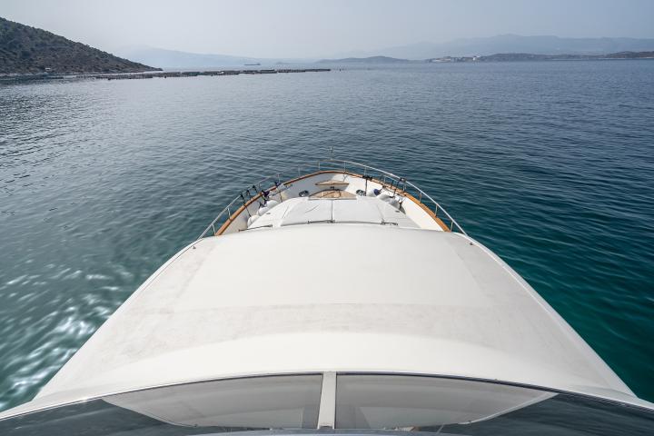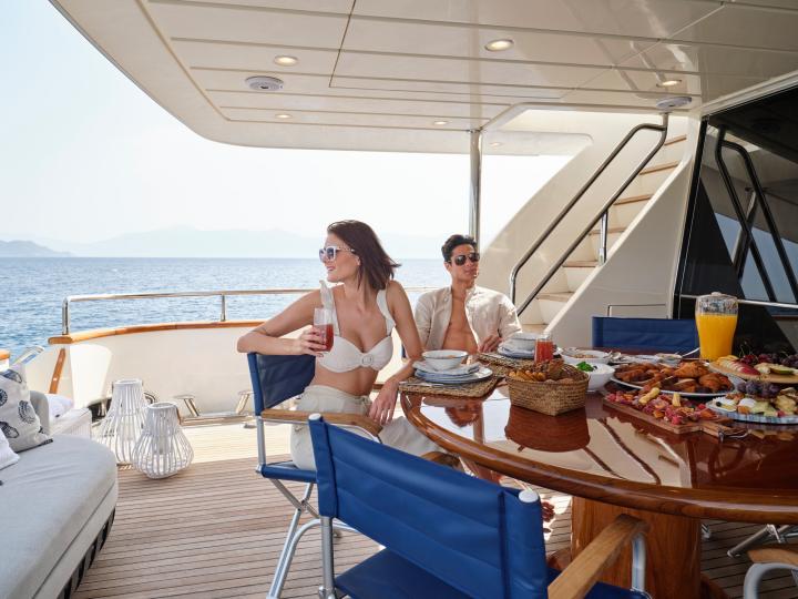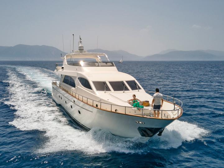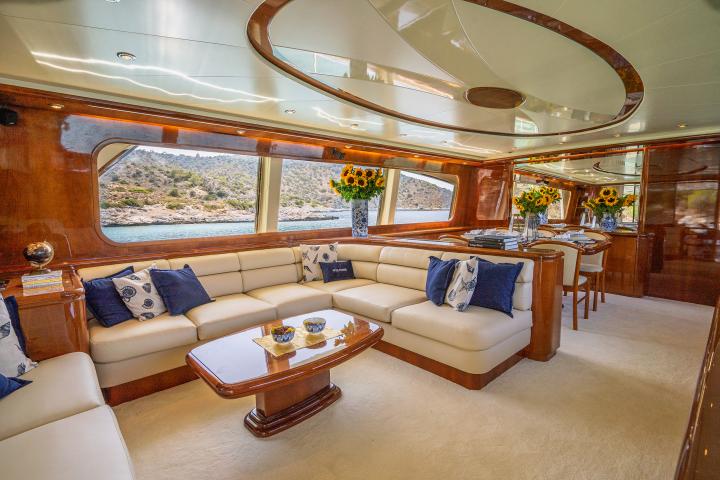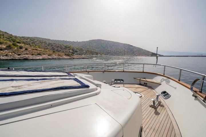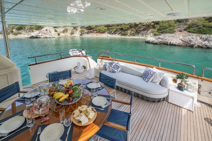 Estia Poseidon, built by Falcon Yachts accommodates up to ten guests in a versatile four-cabin configuration, including a Master Suite, a VIP cabin, and two Twin cabins with Pullman berths, suitable for family groups or couples. She boasts clean, comfortable interiors and a well-balanced layout across all decks, featuring plenty of outdoor dining areas and shaded lounging spaces. She offers smooth travel between destinations with a cruising speed of 20 knots and is ideal for guests who appreciate classic comfort and the calm rhythm of life on the water.
