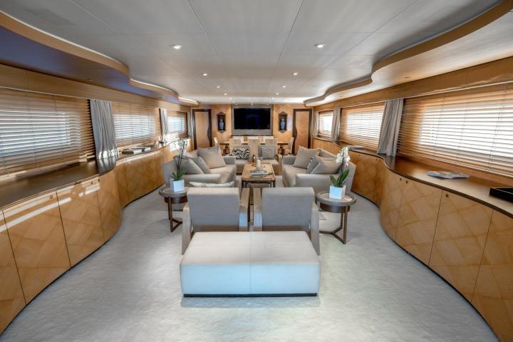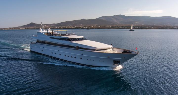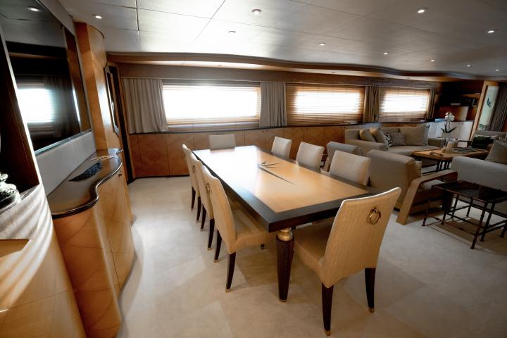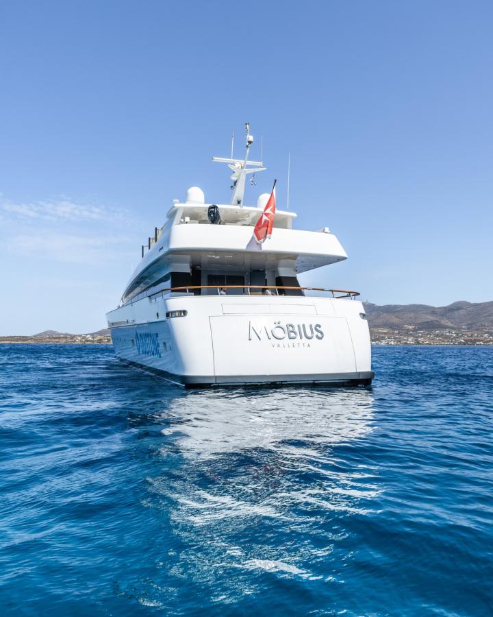 The 38m/124,8ft motor yacht Mobius built by Cantieri di Pisa offers flexible accommodation for up to 11 guests in 5 cabins and features interior styling by Agnes Comar. Boasting an array of sumptuous living areas laid out invitingly to create a warm and welcoming atmosphere onboard, motor yacht Mobius is the perfect luxury charter yacht for friends and family. Built in 1996 and refitted in 2021/2022 (new jacuzzi on the sundeck), Mobius can comfortably accommodate up to 11 guests in 5 en-suite cabins comprising a Master suite, one VIP cabin, one double cabin and two twin cabins (one with a pullman berth). Built with a GRP hull and GRP superstructure, she has impressive speed and great efficiency thanks to her planning hull. Powered by twin Deutz engines, she comfortably cruises at 20 knots, reaches a maximum speed of 22 knots with a range of up to 1,382 nautical miles. Guests will enjoy her wide variety of water toys, including a Seabob, and the new gym equipment available onboard!