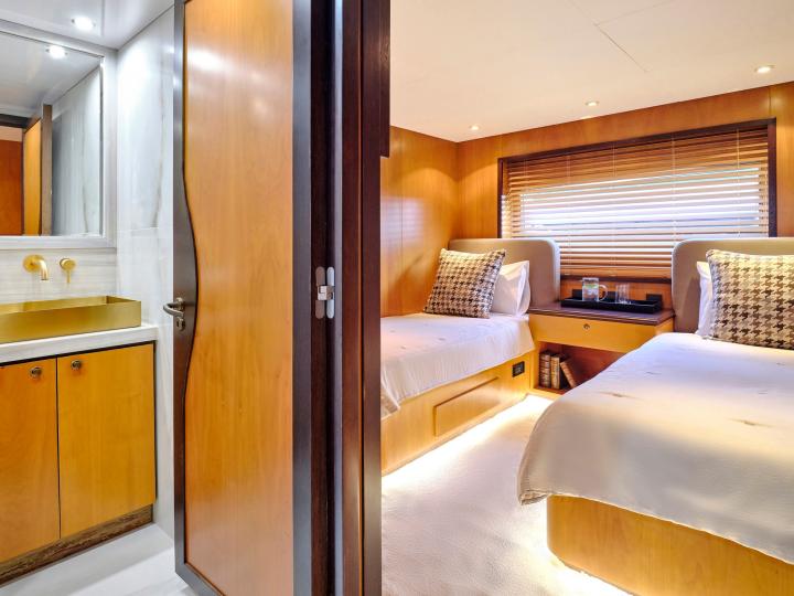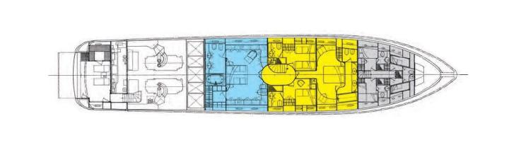 11 guests in 5 cabins, 1 Master with king size bed, 1 VIP with queen size bed, 1 Double cabin, 1 Twin with two single beds & 1 Twin with 2 single beds plus 1 pullman berth, all with en-suites facilities