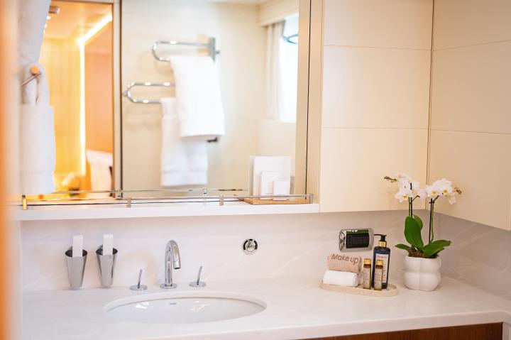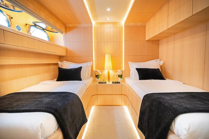 12 guests in 1 Master, 2 VIPs, 2 Twin & 1 Single bed cabin with a pullman berth, all fully air-conditioned with en-suite facilities