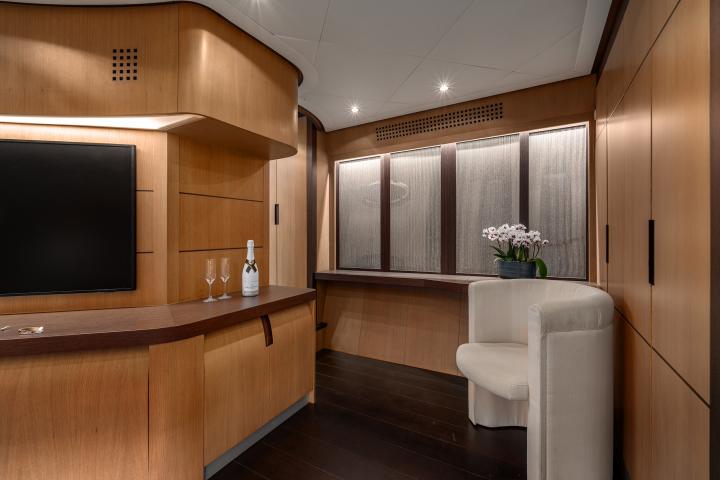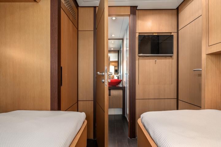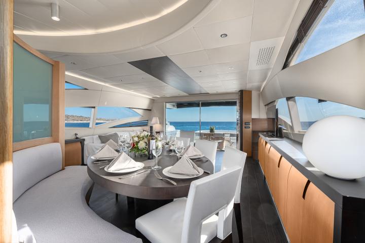 Timeless styling, beautiful furnishings and sumptuous seating throughout create an elegant and comfortable atmosphere. ONE offers the exhilarating thrill of a sports car while providing charter guests with the highest level of comfort on board. Accommodating up to10 guests, she features a layout comprising a round shaped master stateroom, a VIP stateroom and two twin cabins with extra bunk bed ideal for children. With an impressive comfortable cruising speed of 33 knots per hour and a top speed of 41 knots, she is ideal for those who want to cruise fast and expand their options for diverse itineraries