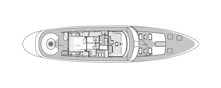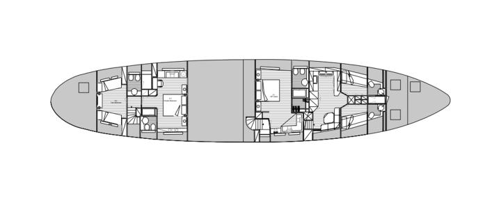 10 guests in two Master Suites (one Master Suite in upper deck along with two fixed extra pullman berths and access to private terrace and one Master Suite in lower deck equipped with walk-in wardrobe and sofa) ,1 VIP Cabin and 1 Twin Cabin ,all with en-suite facilities.