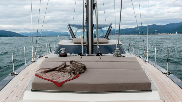 Her mostly unobstructed deck, offers space atop superstructure, with sunbeds and a very cozy lounge ahead of mast, with sofa and cushions around a table, ideal for a post-swim aperitif with snacks, offering shade too.