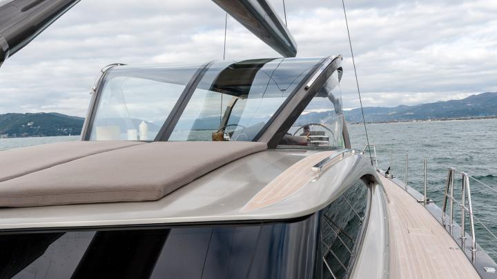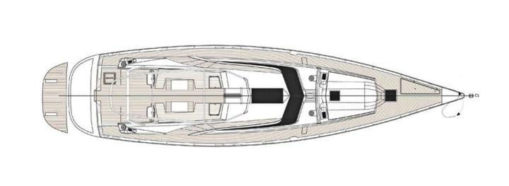 Her outdoor spaces, characterized by the large cockpit area, with two opposite facing sofa beds and two folding dining tables, create a welcoming and spacious lounge spot, sheltered by a hard-top and glass sprayhood, with a retractable roof top.