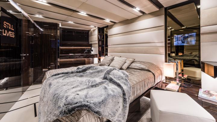 An elevated glass surrounded super-structure is where the indoor lounge is found, with an L-shaped sofa around a large dining table. The indoor is bright with perfect space for spending the early and late hours of the day, with a bar space, entertainment system, TV and proximity to galley area, all covered by high quality materials. Her 4 cabins, allow GIGRECA to host up to 8 guests comfortable, with a large Master suite located aft, a VIP double cabin is found forward the salon and 2 staterooms, a double and a twin with en-suite facilities, covered in marble.