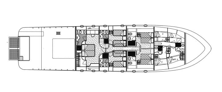 12 guests in 1 Master Suite, 1 VIP on the Main Deck convertible into a Playroom and 4 Twin Cabins all convertible to double (upon request). All cabins with en suite facilities
