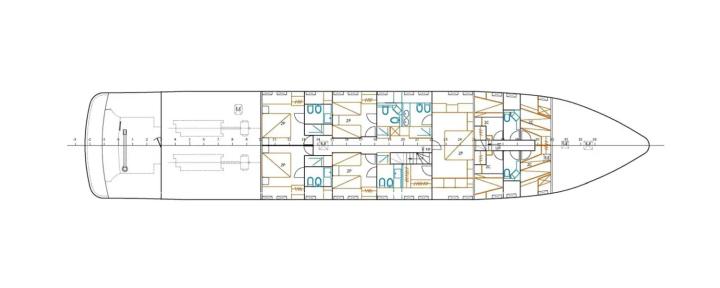 12 guests in 1 Master, 2 VIPs, 2 Twin & 1 Single bed cabin with a pullman berth, all fully air-conditioned with en-suite facilities