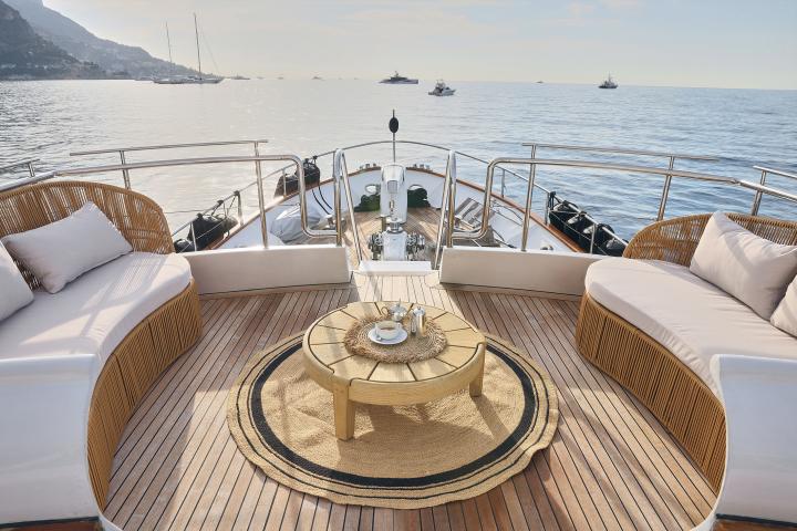 The yacht features a bright main salon with dining area, ample exterior deck spaces for sunbathing and al-fresco meal. She carries a range of water toys including 2 Seabobs, SUPs, wakeboard, inflatable kayak, and snorkelling equipment, supported by a 3.20m tender for transfers and coastal exploration.